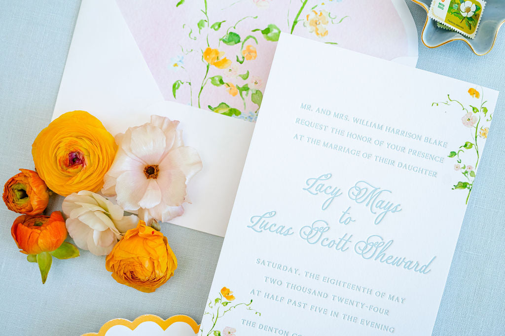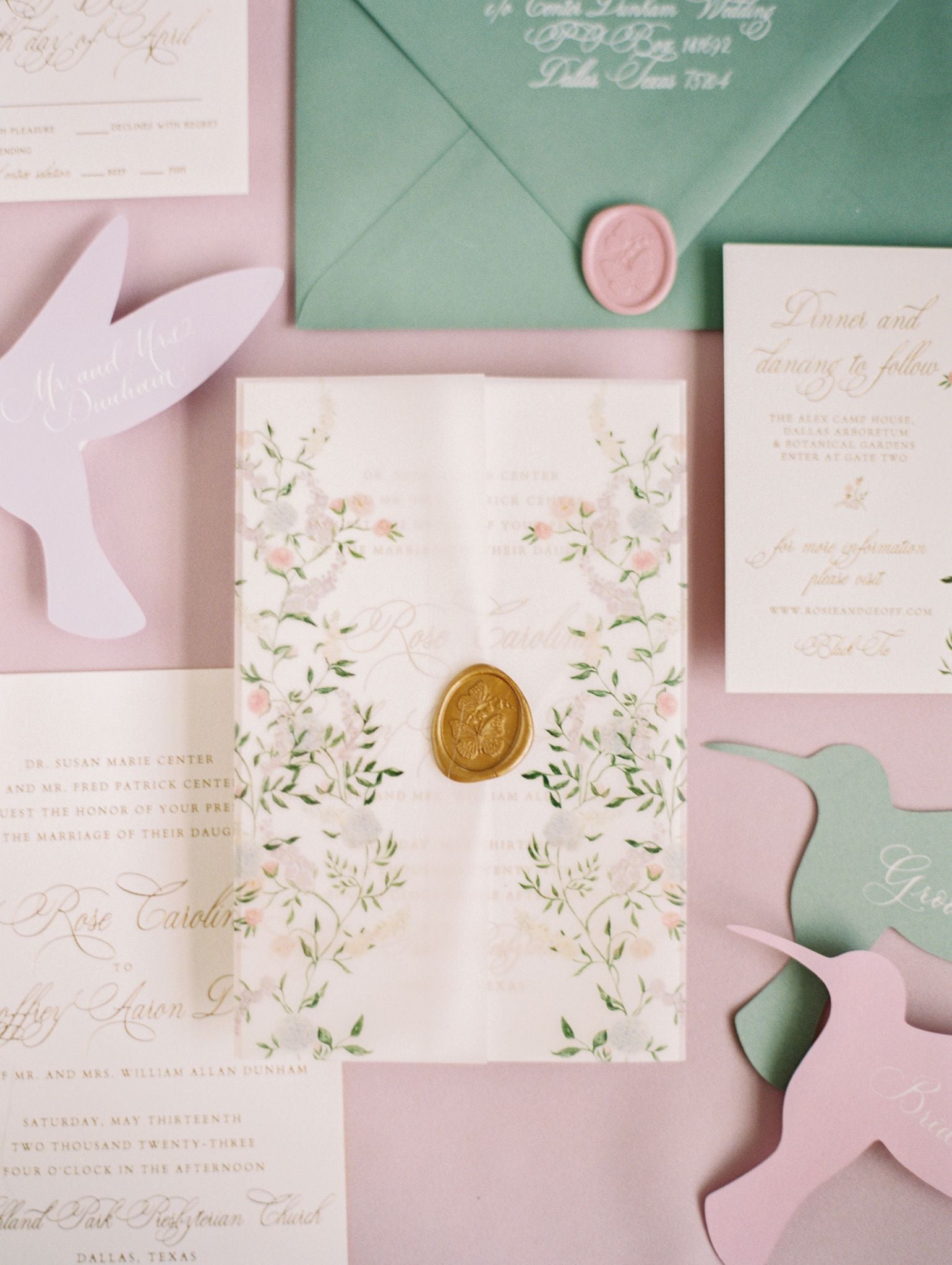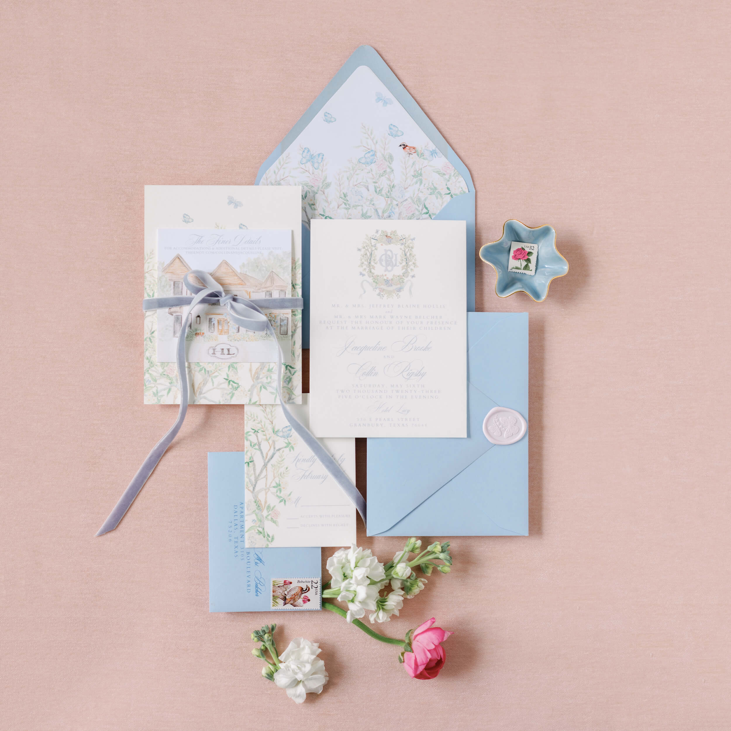 During this process, we will show everything from your envelope liners, wax seals, watercolor artwork and more. As we narrow down your final designs, we present your digital suite proofs in a flatlay design so that you can truly envision your suite before production!